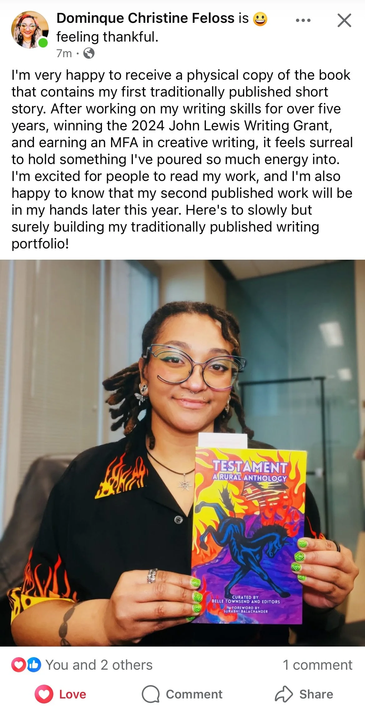 Our graduate Dominque Feloss not only won the 2024 John Lewis Writing Grant and her MFA in Creative Writing this past year, but she also has a short story published in the anthology Testament.