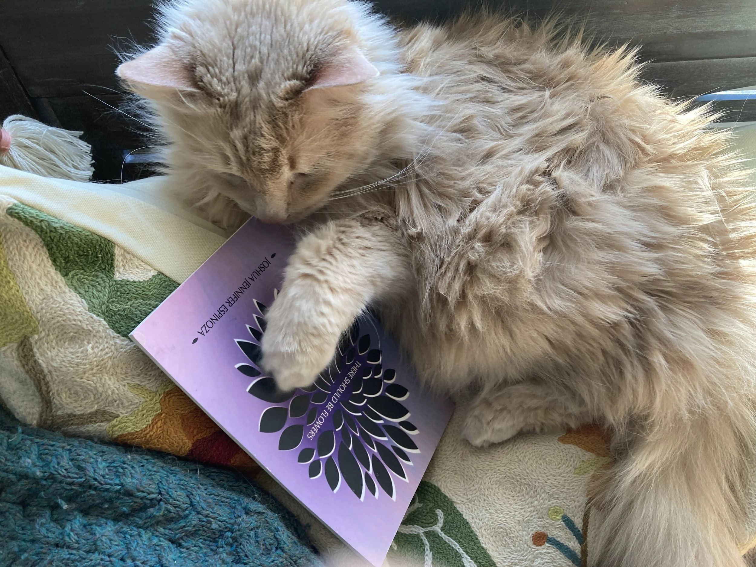 THERE SHOULD BE FLOWERS by our very own Joshua Jennifer Espinoza was an immediate hit with Usha. He’s been hoarding the book, sleeping on or next to it, and he also loves to softly nose around the pages finding his favorite poems. Mishu was allowed a little nibble - but no more.